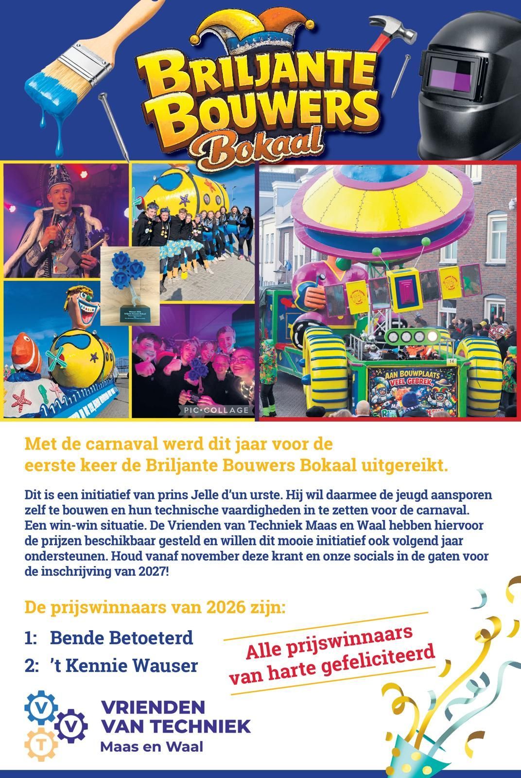 Dit is een initiatief van prins Jelle d'un urste. Hij wil daarmee de jeugd aansporen zelf te bouwen en hun technische vaardigheden in te zetten voor de carnaval. Een win-win situatie. De Vrienden van Techniek Maas en Waal hebben hiervoor de prijzen beschikbaar gesteld en willen dit mooie initiatief ook volgend jaar ondersteunen. Houd vanaf november de krant en de socials in de gaten voor de inschrijving van 2027!